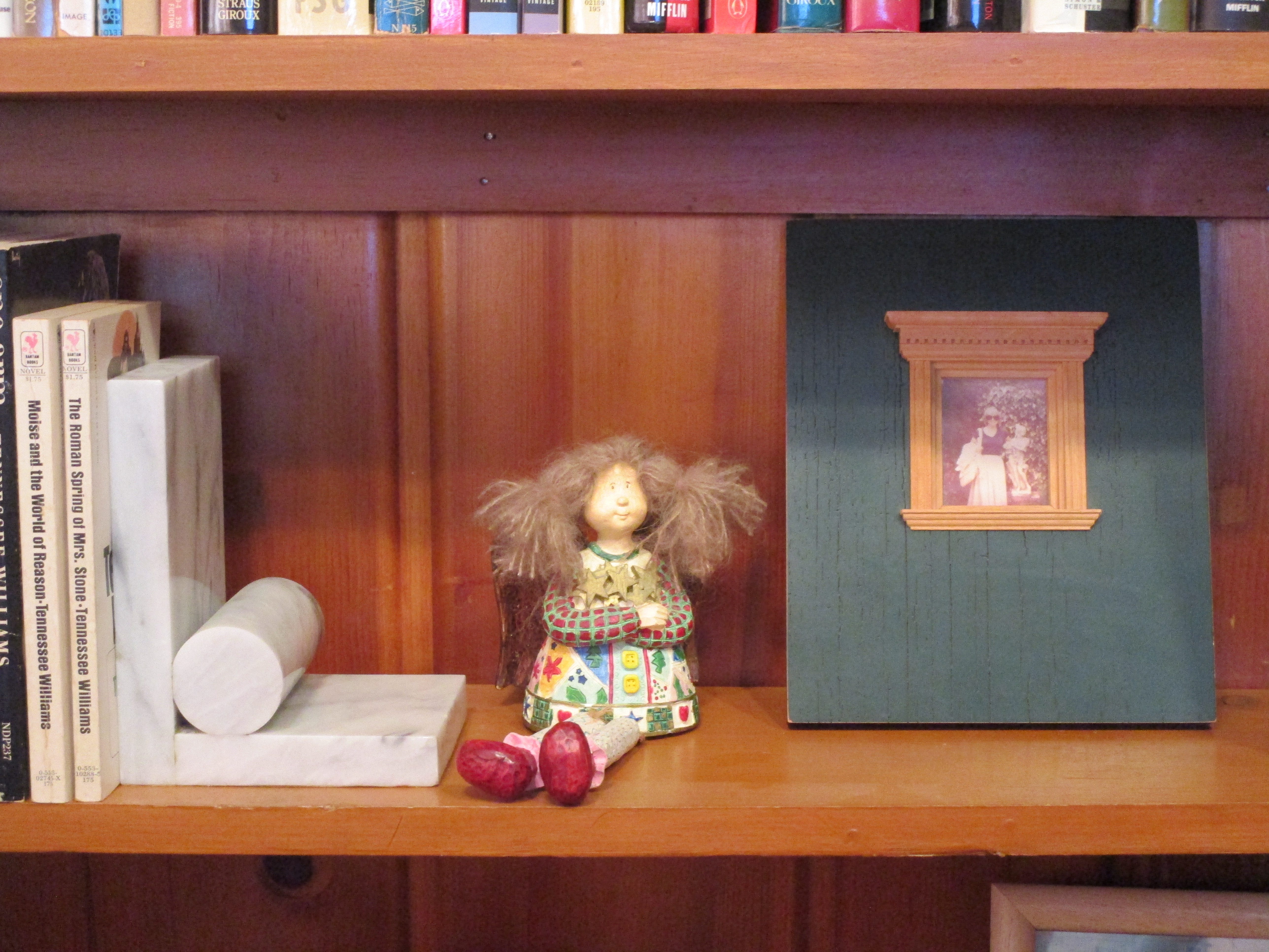 And another below. From right to left, my writing mentor in Henry James’s garden at Rye sometime in the late 70s; the gift she sent everyone on her Christmas gift list the year she recovered from brain surgery in the 90s when I urged her to simplify her list; and one of the marble bookends my girlfriend gave me in 1975: