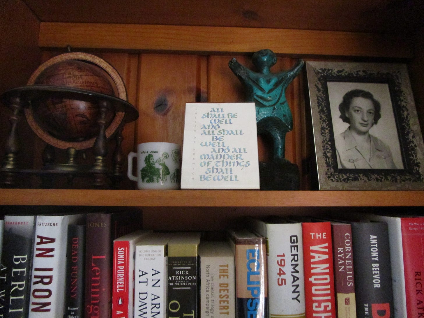 A typical corner in my study: Some of my many WWII books on one shelf, above them from left to right, a globe my spouse gave me when I was traveling to Europe; the Robin Hood cup I drink milk from as a very little kid; an inspirational quote from my mentor when my writing career was looking grim; a statuette that my mother loved and reminds me of her joyous laugh; a photo of her in the 1950s.